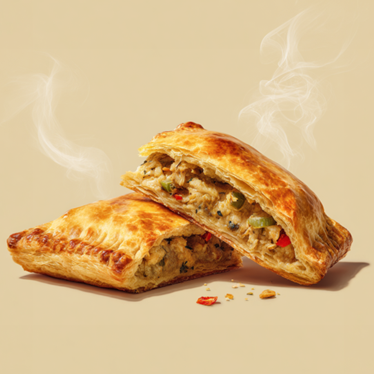 This patty brings the beloved flavors of salt cod (morue) to life. Desalted and gently sautéed with herbs, peppers, and garlic, our codfish filling is rich yet refined. Encased in a golden, artisan puff pastry, it's a nod to Caribbean heritage with an elevated touch.